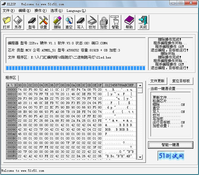 寫入,校驗,運(yùn)行自動完成,軟件中英文自動選擇,適合港臺地區(qū)用戶使用。 特別設(shè)計的燒寫實驗仿真3IN1的公用卡座,